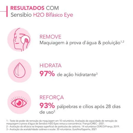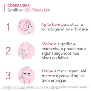 BIODERMA Sensibio H2O Bifásico Eye – Água Micelar Bifásica Não Oleosa para Olhos e Lábios 125ml Propriedades: Sensibio H2O é a 1ª higiene fisiológica sem enxágue com tecnologia micelar. Com um único agente de limpeza criado por Bioderma – a micela, Sensibio H2O EYE purifica e demaquila a pele respeitando seu equilíbrio e sua barreira de proteção natural. A pele torna-se limpa e pura, livre de maquiagem e de 98% das partículas de poluição. Excelente tolerância cutânea e ocular. E 0% álcool, corantes, perfume, sabão ou parabenos. pH fisiológico. Hipoalergênico. Características: Compatível com lente de contato. Sem enxágue. Sem perfume. Demaquilante. Olhos e lábios sensíveis. Alta tolerância. MODO DE USO BIOLÓGICO: Remova a maquiagem suavemente sem a necessidade de esfregar.