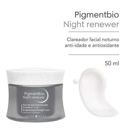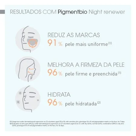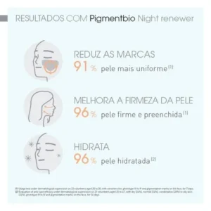 MODO DE AÇÃO BIOLÓGICO: Pigmentbio Night Renewer é o 1º clareador noturno antiidade e antioxidante que renova, uniformiza e revela a luminosidade natural da pele. Sua fórmula traz a patente Lumireveal TechnologyTM, que age em todo o processo biológico da hiperpigmentação para inibi-la desde sua formação, regulando a produção de melanina, até a eliminação das marcas já existentes através de uma intensa renovação celular que revela a luminosidade original da pele. Pigmentbio Night Renewer ainda conta com ação antioxidante e hidratante para prevenir o envelhecimento precoce e fortalecer a barreira de proteção da pele, graças à combinação de vitaminas C, E e Niacinamida. A eficácia antiidade do Hexapeptídeo-2 aumenta a produção de colágeno para uma aparência renovada, uniforme e mais firme desde a manhã seguinte. TEXTURA INOVADORA: sleeping mask – máscara de uso noturno fresca, leve e confortável, à base de água. Benefícios: Em apenas 1 semana: pele mais firme, preenchida, hidratada e mais uniforme. Modo de Uso: Aplique Pigmentbio Night Renewer à noite no rosto e pescoço após limpeza com a Pigmentbio H2O ou Pigmentbio Foaming Cream. Pode ser usado isoladamente ou após Pigmentbio C-Concentrate.