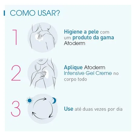 Bioderma Atoderm Intensive Gel Creme Pump: Atoderm Intensive Gel Creme é a 1ª hidratação intensa anti-coceira com textura gel ultra fresca para peles secas e muito secas, irritadas³ com coceira². Sua textura inovadora, leve e fresca de rápida absorção, facilita a aplicação diária do hidrante e aumenta a adesão ao tratamento. Ele acalma as sensações de coceira de forma rápida e duradoura e reduz a vontade de coçar graças à Enoxolona. Graças à vitamina PP (niacinamida), Atoderm Intensive gel-creme ajuda na reposição e fortalecimento da barreira de proteção da pele de forma duradoura. A patente SKIN BARRIER THERAPY ajuda a recuperar o equilíbrio do microbioma, o que pode ser a causa do agravamento da secura da pele. A inovadora tecnologia hidroabsorvente ajuda a reter a água do ambiente de forma a otimizar a hidratação da pele e reforçar a sua função de barreira. Assim, é possível limitar as sensações de coceira² e, portanto, irritação³.